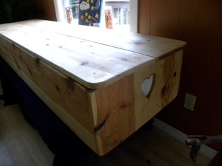 I can’t sleep one night I get up and check on J and D. I’m startled by the look in D’s eyes… It scares me.  J is fuzzy, I tell her to sleep, I leave the room.  I see M is restless. I go back to bed it’s cold. I pull Arlo close to me. I’m shaking, I lie in the darkness for what seems like hours but the clock has only moved 15 minutes. I know the time has come, my heart races, I hold Arlo tight, I have to remind myself of who D was. He would not harm us, death has only come for one, we are safe. I go into J’s room she is standing there. Lost, waiting, confused…. Time begins to move forward again. D is dead the tether has snap, there is no “feeling” of him anywhere now. His body his empty he is gone. We wake M and together we wash and wrap D. It is quite beautiful to see him wrapped in muslin laid upon evergreens and rose petals in the pine box his son made.
